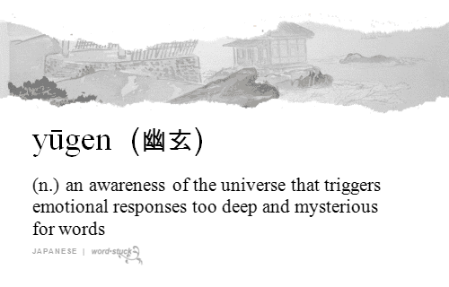 Emosi ini berkaitan dengan sesuatu yang Anda rasakan di dalam hati namun tidak bisa ditunjuk dengan jari dan sebaiknya tidak perlu dijelaskan dengan kata kata. Yugen mengajak kita untuk merasakan misteri alam semesta dan menyadari bahwa ada hal hal besar di luar sana yang melampaui pemahaman akal manusia. Ini adalah apresiasi terhadap keindahan yang tidak mencolok yang tersembunyi di balik bayang bayang.